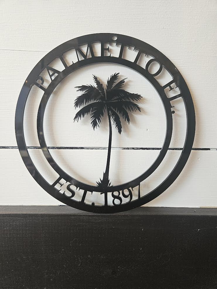Introduce a touch of charming elegance to your space with our exquisite circular laser-cut black acrylic sign. This beautifully crafted sign features the word "Palmetto, FL" elegantly displayed at the top, framing the iconic Palmetto tree at its center. Below, the inscription "Est. 1897" serves as a nod to the rich history of this picturesque town.