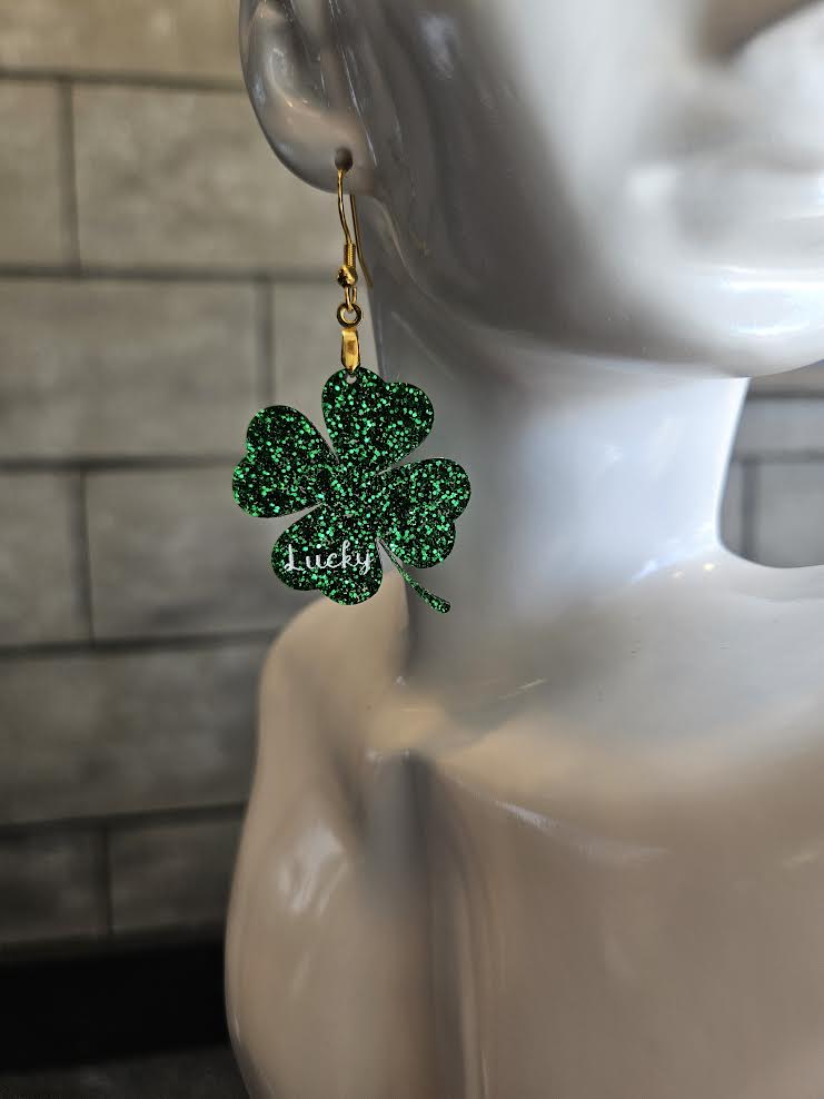 Each piece features a sophisticated engraving of the word "lucky," beautifully accented by the shimmering green glitter that catches the light with every movement. The lightweight design ensures comfortable wear throughout the day, making them perfect for casual outings or festive occasions.